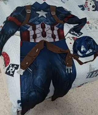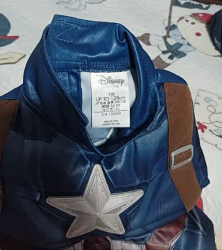 Disfraz completo del Capitán América, ideal para fiestas o eventos. - Incluye traje y máscara. - Diseño inspirado en el personaje. - Talla 7 a 8 año