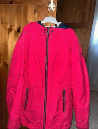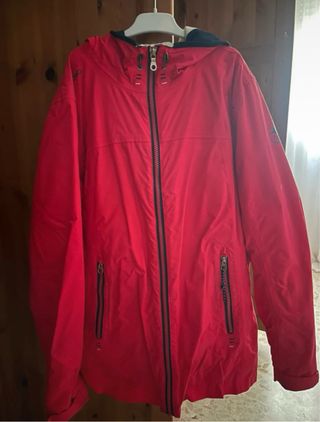 Cortavientos Decathlon de color rojo, ideal para actividades al aire libre. - Capucha ajustable. - Cierre de cremallera. - Bolsillos con cremallera.