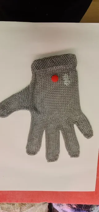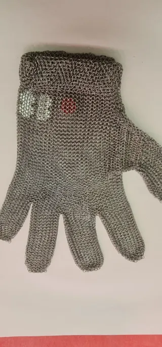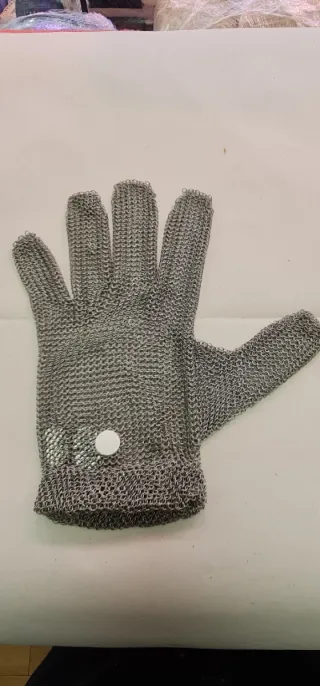 Guante de protección fabricado en malla metálica. Ideal para tareas que requieran protección contra cortes. - Material: Malla metálica. - Diseño: Guante de mano. - Cierre: Botón blanco en la muñeca. - talla S Guante 5 dedos sin puño Cumple con las normas de las EPI: UE 2016/425: Categoría III, conforme a la norma de guantes y protectores de brazo contra cortes y golpes de cuchillos de mano ISO 13999-1 y EN 1082-1, conforma contra la norma de guantes y protectores de brazo que protegen contra cortes por cuchillos eléctricos EN 14328 (2005) 100 % inoxidable Ajuste en la muñeca mediante resorte.
