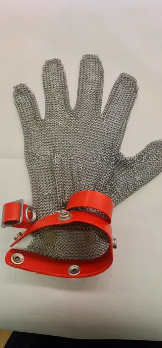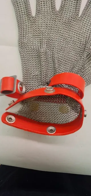 Guante de protección fabricado en malla metálica. Diseñado para ofrecer seguridad en tareas que requieran protección contra cortes. - Material: Malla metálica. - Color: Plateado. - Cierre: Detalle de botón rojo en la muñeca. - talla M Con correa de ajuste.