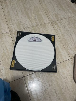 Báscula mecánica redonda de color blanco. Muestra el peso en kilogramos. - Diseño clásico y fácil de usar. - Indicador analógico de gran tamaño. - Superficie antideslizante.