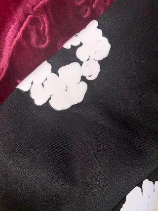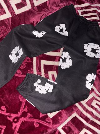 Pantalón de tela negra con un diseño de flores blancas. talla M - Diseño de flores blancas en relieve. - Tejido negro.