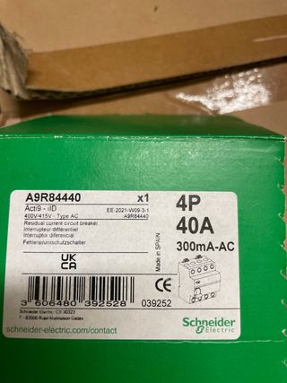Interruptor automático trifásico Schneider Electric Acti9 iD. - Modelo: A9R84440 - Tensión: 400V/415V Tipo AC - Corriente nominal: 40A - Sensibilidad: 300mA-AC - Tipo: Residual current circuit breaker - Fabricado en España