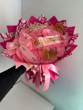 Precioso ramo de rosas eternas, perfecto para regalar. - Flores de tela en color rosa. - Decorado con lazo rosa y mariposas doradas. - Incluye corona y cinta Feliz Cumpleaños. Visita @regalos_cintia en todas nuestras redes sociales