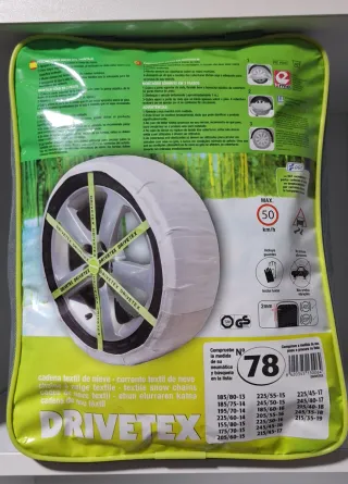 Cadenas textiles para la nieve de la marca DRIVETEX. - Talla 78. - Incluye bolsa de transporte. -Incluye guantes. - Velocidad máxima recomendada: 50 km/h. - No producen vibraciones. -Consultar medidas del neumático en la foto.