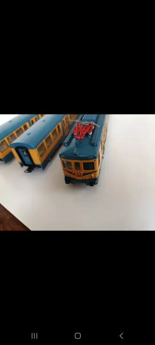 Conjunto locomotorade vagones de tren Ibertren en escala HO. Los vagones son de color azul con detalles en amarillo. Digital ver fotos y sin caja , va perfecta y sin apenas uso en vía. Destacar que estravie un pantografo. Y la duda que tengo . Es si venía con enganche delantero de la máquina y trasero último vagon. Ver fotos ..por lo demás perfeca . Sin roces con sus topes y enganches . Hago envios - Modelo: Suiza UT600. - Colores: Azul y amarillo.