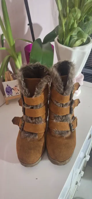 Botas de piel para mujer con un diseño moderno y detalles únicos. - Material exterior de piel. - Forro interior de pelo. - Tres correas con hebillas metálicas decorativas. - Tacón grueso para mayor comodidad. Súper cómodas al andar, usadas muy poco, llevan guardadas mucho tiempo. Se venden porque me equivoqué de talla y me quedan un pelin grande, son talla 37.