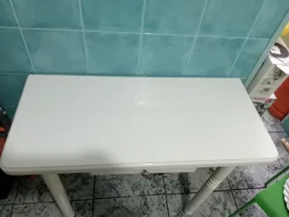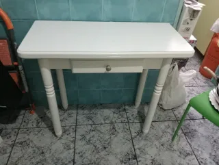 Mesa de cocina con un diseño sencillo y funcional. Ideal para el día a día. - Tablero blanco. - Patas de madera. - Un cajón.