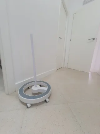 Base con ruedas para lámpara lupa. Facilita el desplazamiento de la lámpara. - Base circular con acabado gris. - Ruedas para movilidad.