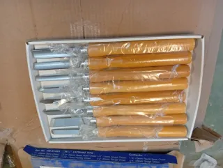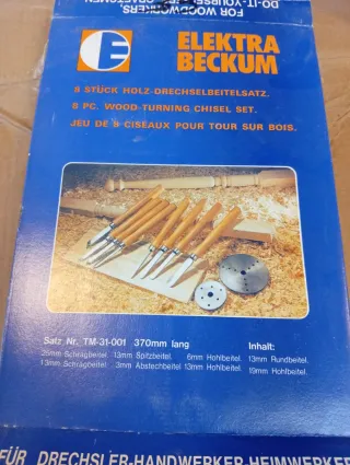 Set de 8 gubias para madera ELEKTRA BECKUM, modelo TM-31-001 de 370mm de largo. - 25mm Schrägbeitel - 13mm Spitzbeitel - 6mm Hohlbeitel - 13mm Rundbeitel - 13mm Schrägbeitel - 3mm Abstechbeitel - 13mm Hohlbeitel - 19mm Hohlbeitel
