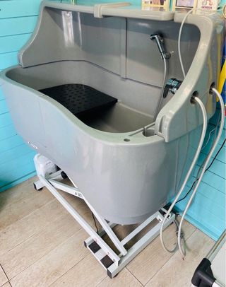 Bañera para mascotas Glenbath SetterBakio con elevador eléctrico Diseñada para peluquerías caninas y felinas, permite ajustar la altura del perro a una postura ergonómica, cuidando tu comodidad.La altura puede ser regulada mediante pedales o mando, ambos incluidos. Los pedales permiten ajustarla sin usar las manos. .El cuerpo de la bañera está fabricado en polietileno con un diseño vanguardista muy ergonómico, pensado para el bienestar postural. El fondo presenta un relieve para evitar deslizamiento. sistema de Ozono de regalo valorado en 300€. PRECIO NO NEGOCIABLE