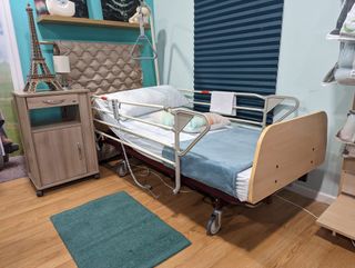 Cama de uso domiciliario y asistencial. Provista de somier articulable eléctrico. Se regulan: cabecero, pies y carro elevador. El carro elevador eléctrico permite bajar la cama para facilitar las transferencias desde o a la silla, o elevarla para que los cuidadores puedan asistir al paciente más cómodamemte. Está provisto de 4 ruedas con freno que permiten mover la cama o bloquearla cuando sea necesario. El accionamiento de las articulaciones de tronco, piernas, y ajuste en altura del carro elevador, se realizan desde el mismo mando. Se incluyen barandillas y colchón antiescaras (Ergofoam 28)