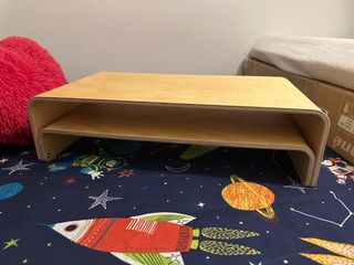 Práctico soporte de madera para elevar tu monitor o portátil. Su diseño curvo le da un toque moderno y elegante. - Fabricado en madera contrachapada. - Diseño de dos niveles para mayor organización. - Base estable para colocar dispositivos.
