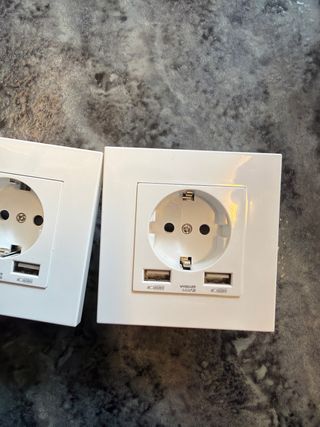 Pack de dos enchufes de pared blancos con puertos USB integrados. - Diseño moderno y minimalista. - Dos puertos USB para carga. - Salida USB: 5V / 2100mA.