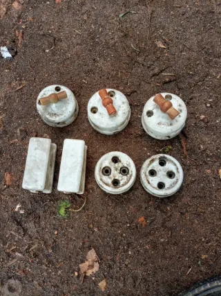 Conjunto de piezas antiguas de porcelana para instalaciones eléctricas. - Tres interruptores redondos con palanca de madera. - Dos piezas rectangulares de porcelana. - Dos bases de enchufe redondas con cuatro orificios.