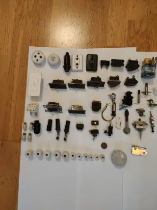 Interruptores, conmutadores, de cruzamiento, ladrón pulsador, conectores de plancha, sujeta cables o aisladores de porcelana para sujetar cables trenzados antiguos,etc. Porta fusibles. Lampara alogeno H7. Soporte de bocina. Tulipa de luz interior de coche. Etc. Es antiguo casi todo. Vendo todo por 18 €. Tengo muchas mas cosas en mi perfil.