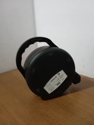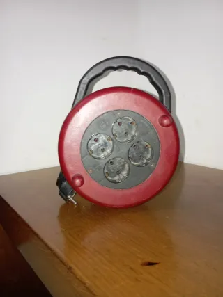 Regleta alargador con cuatro enchufes y asa para enrollar el cable. - Color rojo y negro. - Enchufes tipo F (Schuko). - Asa de transporte. - Enrollacables.