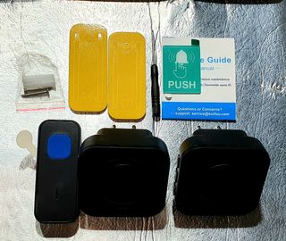 Timbre inalámbrico SURFOU, kit de timbre electrónico de largo alcance de 400 m con 2 receptores exteriores enchufables, 55 melodías con 5 niveles de volumen para el hogar, indicador LED azul, negro 792684480192 sin pegatinas de doble cara