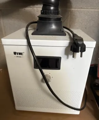 Extractor de humos UYUE modelo JH100. - Diseño compacto y blanco. - Panel frontal con pantalla y control giratorio. - Manguera flexible negra. - Enchufe europeo. Dimensiones del producto: 265 mm x 215 mm x 315 mm (largo x ancho x alto). Peso neto del producto: 6,5 kg. El peso del paquete completo es de aproximadamente 8 kg, con unas dimensiones de embalaje de 295 mm x 265 mm x 495 mm.