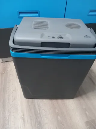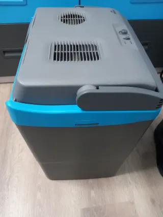 Nevera portátil de camping de la marca Crivit. Ideal para mantener tus bebidas y alimentos frescos. Enchufable con tomas tanto para coche o casa. 30 litros de capacidad, boten para poner frio o calor. En muy buen estado, utilizada muy pocas veces. - Color gris y azul. - Asa para facilitar el transporte. - Compartimento superior con rejillas de ventilación y controles.