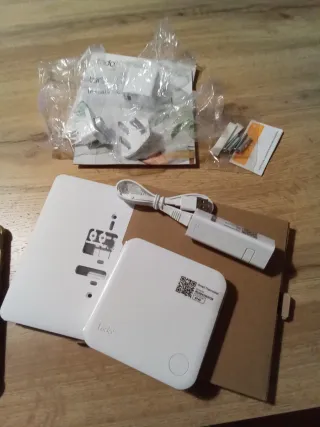 Kit de inicio Tado para termostato inteligente cableado. Incluye los componentes necesarios para su instalación. - Tado Smart Thermostat. - Base de montaje. - Cable USB. - Adaptadores de enchufe. - Tornillos y tacos.