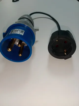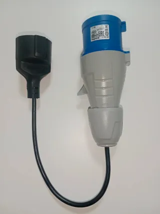 Adaptador de enchufe industrial Cetac CEE de 32A a toma Schuko. Marca del conector industrial: Legrand (calidad profesional). Entrada: Clavija industrial CEE 2P+T (2 polos + tierra) de 32A - 6h / 200-250V~. Salida: Base de enchufe hembra Schuko estándar (16A / 250V). Protección: Grado IP44 (resistente a salpicaduras de agua y polvo), ideal para uso en exteriores. Usos Comunes: Camping y Caravanas: Conecta tu laptop o electrodomésticos en postes de luz de campings.