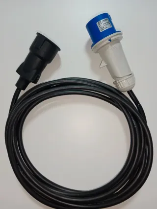Adaptador de corriente con cable de 4 metros de longitud. Permite conectar un enchufe Cetac de 16A a una toma Schuko. Longitud: 4 metros de cable flexible y resistente. Conector de Entrada (Macho): Clavija industrial IDE (Azul), tipo CEE 2P+T, 16A, 200/250V~. Fabricado en España. Conector de Salida (Hembra): Base de enchufe estándar Schuko reforzada (color negro), ideal para conectar cualquier electrodoméstico o herramienta común. Uso: Ideal para sacar luz de las torretas de camping