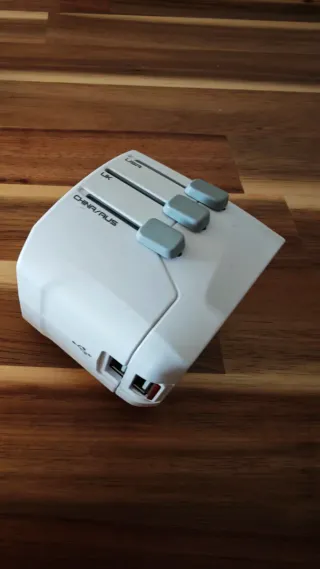 Adaptador de corriente universal para tus viajes. - Diseño compacto y portátil. - Compatible con múltiples tipos de enchufes.