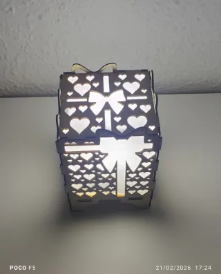Lámpara artisanal de mesa con un diseño encantador y original de forma caja de regalo, perfecta para añadir un toque cálido a cualquier espacio, con bombilla recargable, puedes ponerla donde quieras por no tiene enchufe - Decorada con un patrón de corazones. - La luz crea un ambiente acogedor. (Mas cosas en mi perfil)