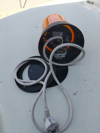 Sirena de advertencia con luz giratoria de color naranja. - Base negra. - Cable de alimentación con enchufe europeo. Se puede empotrar en la puerta de un garaje, Esa era su función, y le he puesto el cable blanco para comprobar que funciona, como así es. Tiene marcado E3 Homologada. Abstenerse ofertas absurdas