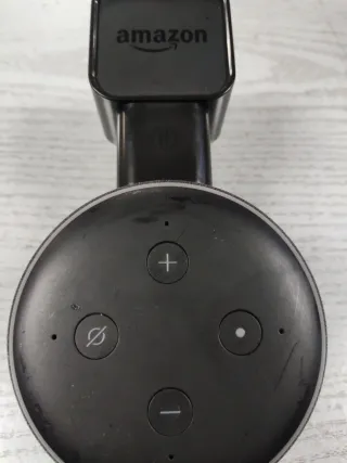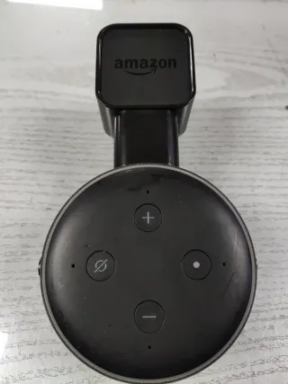 Altavoz inteligente Amazon Echo Dot de tercera generación. Con soporte / enchufe a la pared . Disfruta de la música, haz preguntas y controla tu hogar. Color negro. - Diseño compacto y elegante. - Botones de control en la parte superior.