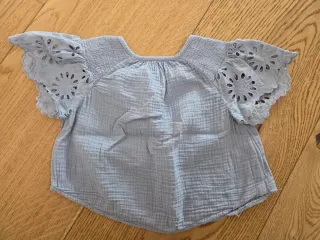 Preciosa blusa de Zara para bebé, con un bonito diseño. Tela tipo muselina con precioso detalle bordado en las mangas. Talla 18-24 meses, 86cm. - Color azul claro. - Tejido ligero y con textura. - Mangas cortas con detalles calados. - Cierre de botones en la parte delantera.