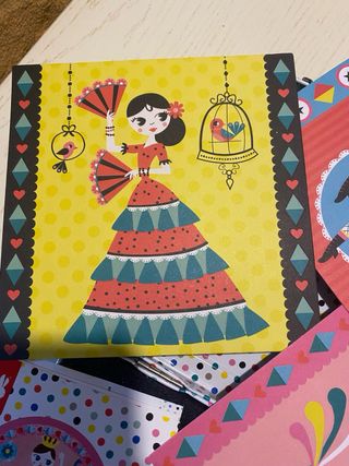 ERAN 6 CUADROS PERO SOLO QUEDAN TRES POR HACER. SIN EMBARGO EL MATERIAL ESTA INTACTO. Set de cuadros para decorar con brillantinas. - Incluye 4 láminas con diseños de bailarinas y personajes. - Vienen 7 botes de brillantina de diferentes colores. - Incluye pinceles para aplicar la brillantina.