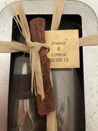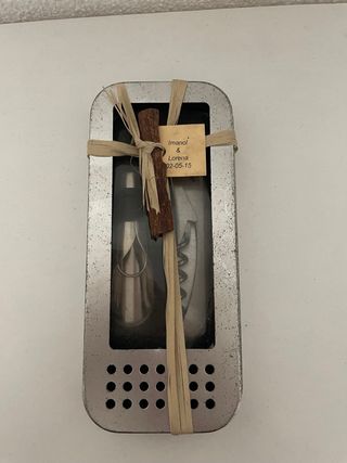 Set de accesorios para vino presentado en una caja metálica. - Incluye sacacorchos y tapón. - Decorado con una rama de canela y cinta de rafia. - Etiqueta con nombres Imanol & Lorena y fecha 02-05-15.