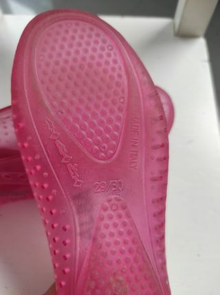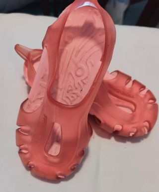 Escarpines rosas de plástico, ideales para la playa o piscina. - Talla 29-30. - Cierre de botón azul. - Diseño con perforaciones. Más calzado infantil en mi perfil