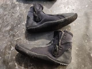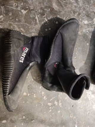 Par de escarpines de neopreno con suela. Los de bota marca Dacor ,5mm de grosor con cremallera talla 44 , precio 18€ Los Okespor talla 42 , 3mm de grosor suela goma ,Precio 12€ - Material exterior de neopreno. - Suela de goma con relieve. - Interior naranja.