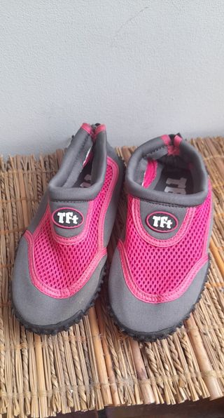 Se venden escarpines para niña, marca TFT. Son de color gris y rosa. Comprados en Warner Beach. Buen estado. - Ideales para la playa,piscina, rio... - Diseño cómodo y ligero. - Talla 32