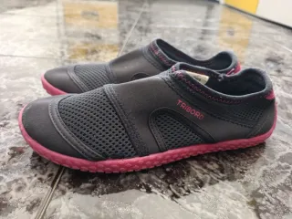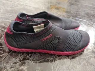 Escarpines de la marca Tribord, ideales para actividades acuáticas. - Color gris con detalles en rosa. - Suela de goma antideslizante. - Material textil transpirable.