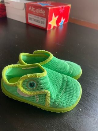 Zapatillas de agua para niños, ideales para la playa o piscina. Son ligeras y cómodas. Usadas dos dias, nuevas. - Material de malla transpirable. - Suela de goma. - Cierre de velcro.