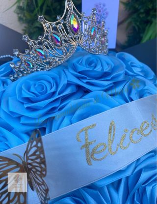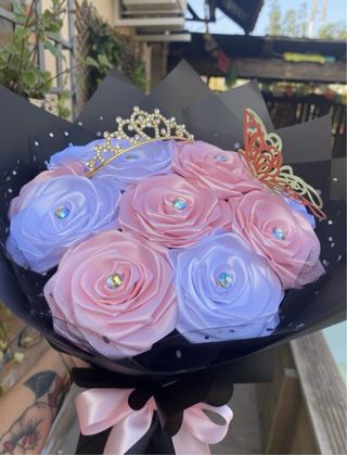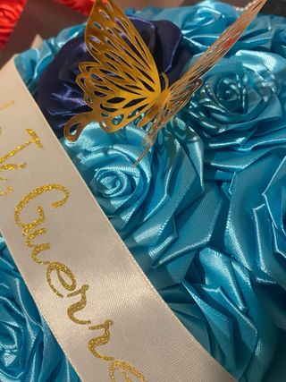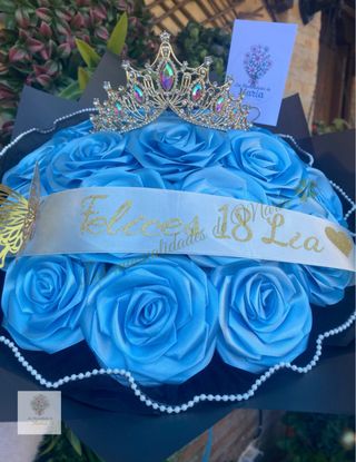 Espectacular ramo hecho a mano con 18 rosas de cinta de satén, elaboradas artesanalmente con mucho detalle. Diseño elegante en tonos azules, decorado con mariposas doradas, cinta personalizada con mensaje y envoltorio premium. 📏 Diámetro aproximado: 30–34 cm. ✨ Ideal para regalar en cumpleaños, aniversarios, graduaciones, Día de la Madre o cualquier ocasión especial. 🎀 Personalizable con mensaje, nombre y colores. 🖐️ Trabajo 100% artesanal, único y duradero. 🎁 Un regalo original que no se marchita y conserva su belleza para siempre. 📩 Para más información o personalización, ¡contáctame sin compromiso!