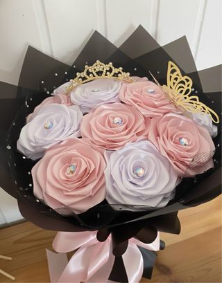 Precioso ramo artesanal compuesto por 12 rosas hechas a mano con cinta satinada, en delicados tonos rosa palo y blanco. Cada rosa está cuidada al detalle para ofrecer un acabado elegante y especial. Características: • 12 rosas de cinta satinada • Colores: rosa palo y blanco • Hecho a mano con mucho mimo Diámetro del arreglo floral: 28–30 cm aprox. Perfecto para bodas, aniversarios, cumpleaños o decoración del hogar. Estado: nuevo. Entrega en mano o envío a través de Wallapop.
