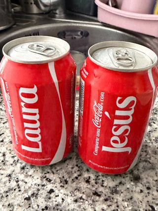 Dos latas de Coca-Cola personalizadas con nombres. - Lata con el nombre Laura. - Lata con el nombre Jesús. - Diseño clásico de Coca-Cola.