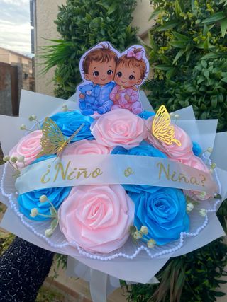 Ramo artesanal elaborado con rosas de listón en tonos azul y rosa, diseñado para celebraciones de revelación de género. Características: • Rosas de listón hechas a mano • Cinta decorativa con mensaje “¿Niño o Niña?” • Detalles elegantes de mariposas, perlitas y flores delicadas • Diseño interior decorativo Altura total: 35–40 cm Diámetro del ramo: 32–35 cm Perfecto para baby showers, sesiones de fotos o decoración temática. 📌 El ramo mostrado es el modelo de la publicación. Se entrega tal como aparece en las imágenes.