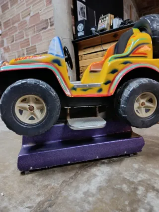Atracción infantil con diseño de Jeep Suzuki. Funciona sin dinero. Ideal tienda bares peluquería - Colores vibrantes: amarillo, rojo y verde. - Ruedas grandes y robustas. - Base de apoyo morada.