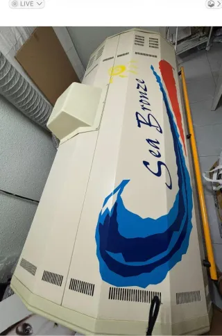 Solárium profesional marca Sea Bronze. Diseñado para ofrecer una experiencia de bronceado. Se vende por cierre de centro de estética. - Diseño orizontal - Decoración con motivos de sol y olas. - Rejillas de ventilación en la base. - Tres placas faciales - ventiladores parte superior (cabezal) y parte inferior (pies)