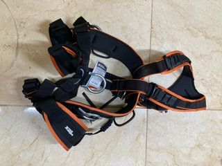Arnés Rock Empire Atlas UNI en color negro y naranja. - Hebillas de ajuste rápido. - Puntos de anclaje. - Cinturón y perneras acolchados.