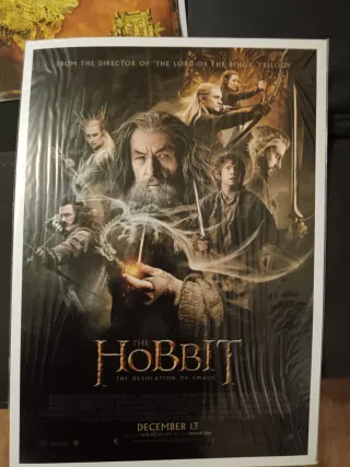 Póster de la película The Hobbit: La Desolación de Smaug y El Señor de los Anillos. - Presenta a los personajes principales de la saga. - Incluye el título de la película y la fecha de estreno. - From the director of 'The Lord of the Rings Trilogy'. - Mide 45 x 32cm.