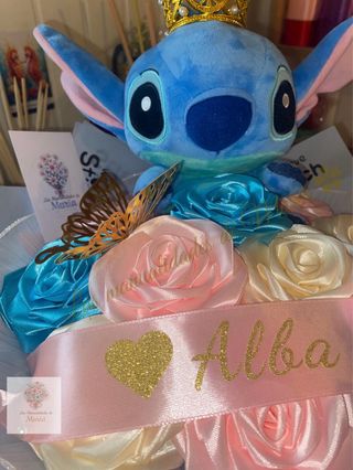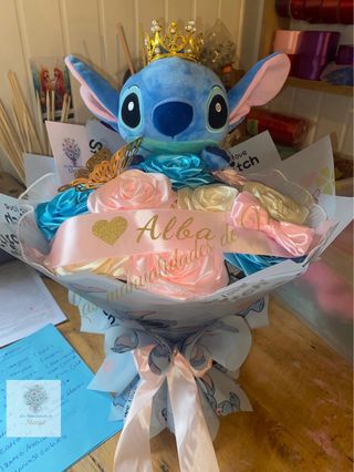Precioso ramo hecho a mano con 10 rosas de cinta de satén, elaboradas artesanalmente con mucho detalle. Incluye un adorable peluche azul con corona, decorado con lazos, mariposa dorada y envoltorio elegante en tonos pastel. 📏 Diámetro aproximado: 24–26 cm. ✨ Ideal para regalar en cumpleaños, aniversarios, nacimientos, San Valentín o cualquier ocasión especial. 🎀 Personalizable con nombre y colores. 🖐️ Trabajo 100% artesanal, único y duradero. 🎁 Un regalo original que no se marchita y conserva su belleza para siempre. 📩 Para más información o personalización, ¡contáctame sin compromiso!