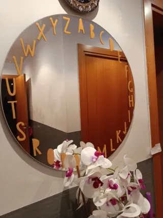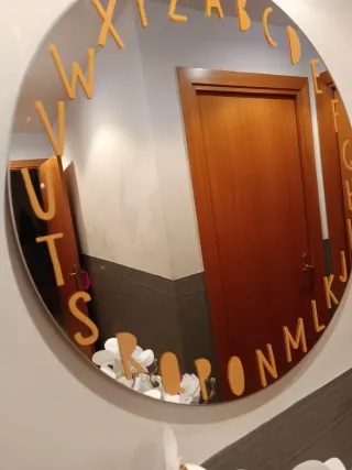 Espejo redondo con un diseño original y decorativo. - Marco con letras del abecedario. - Ideal para añadir un toque único a cualquier habitación.