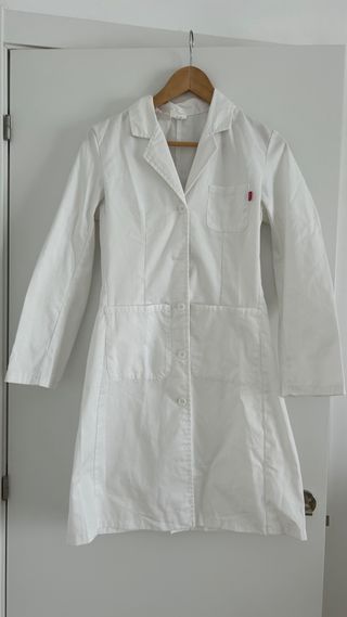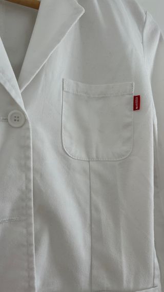Bata blanca de uniforme de trabajo, ideal para entornos profesionales. Entallada talla 36. - Cuello solapa. - Cierre de botones. - Dos bolsillos inferiores. - Un bolsillo superior.